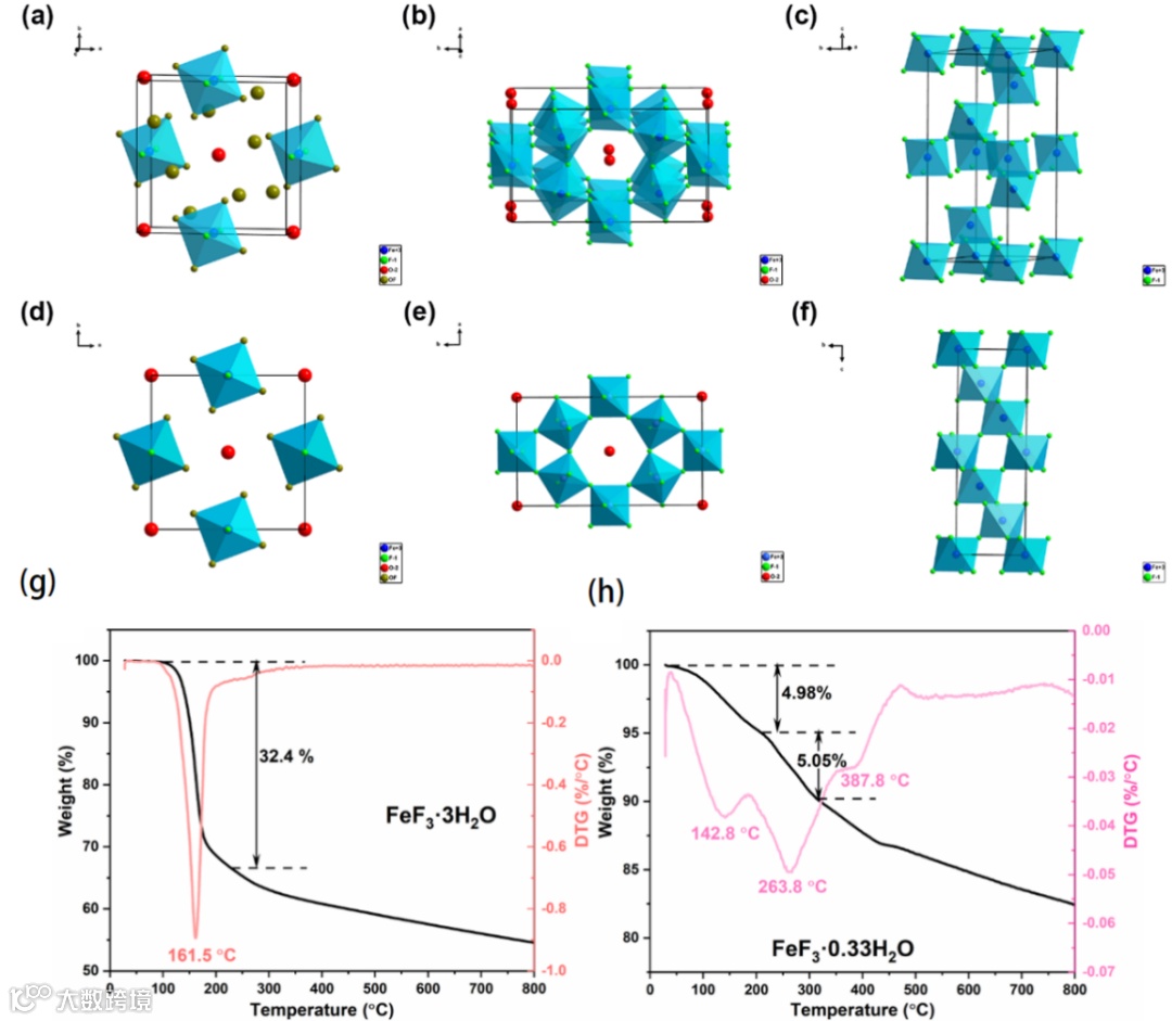 图2 FeF3-3H2O的结构(a)及其沿[001]方向的投影(d);FeF3-0.33H2O的结构(b)及其沿[001]方向的投影(e);FeF3的结构(c)及其沿[100]方向的投影(f)。FeF3-3H2O(g)和FeF3-0.33H2O(h)在N2气氛中的TG曲线。