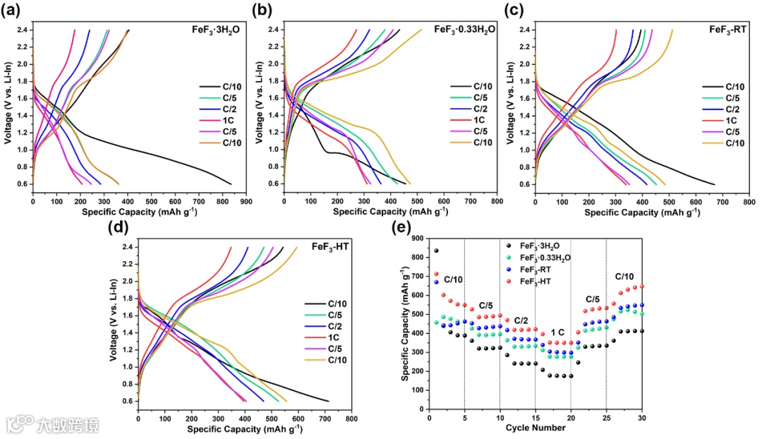 图6 (a) FeF3-3H2O (b) FeF3-0.33H2O (c) FeF3-RT (d) FeF3-HT在特定速率下的充电和放电曲线 (e) 四个正极的放大性能图