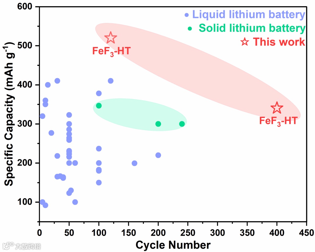 图10. 本工作中的氟化铁正极的循环圈数和容量与其他文献报道的比较。