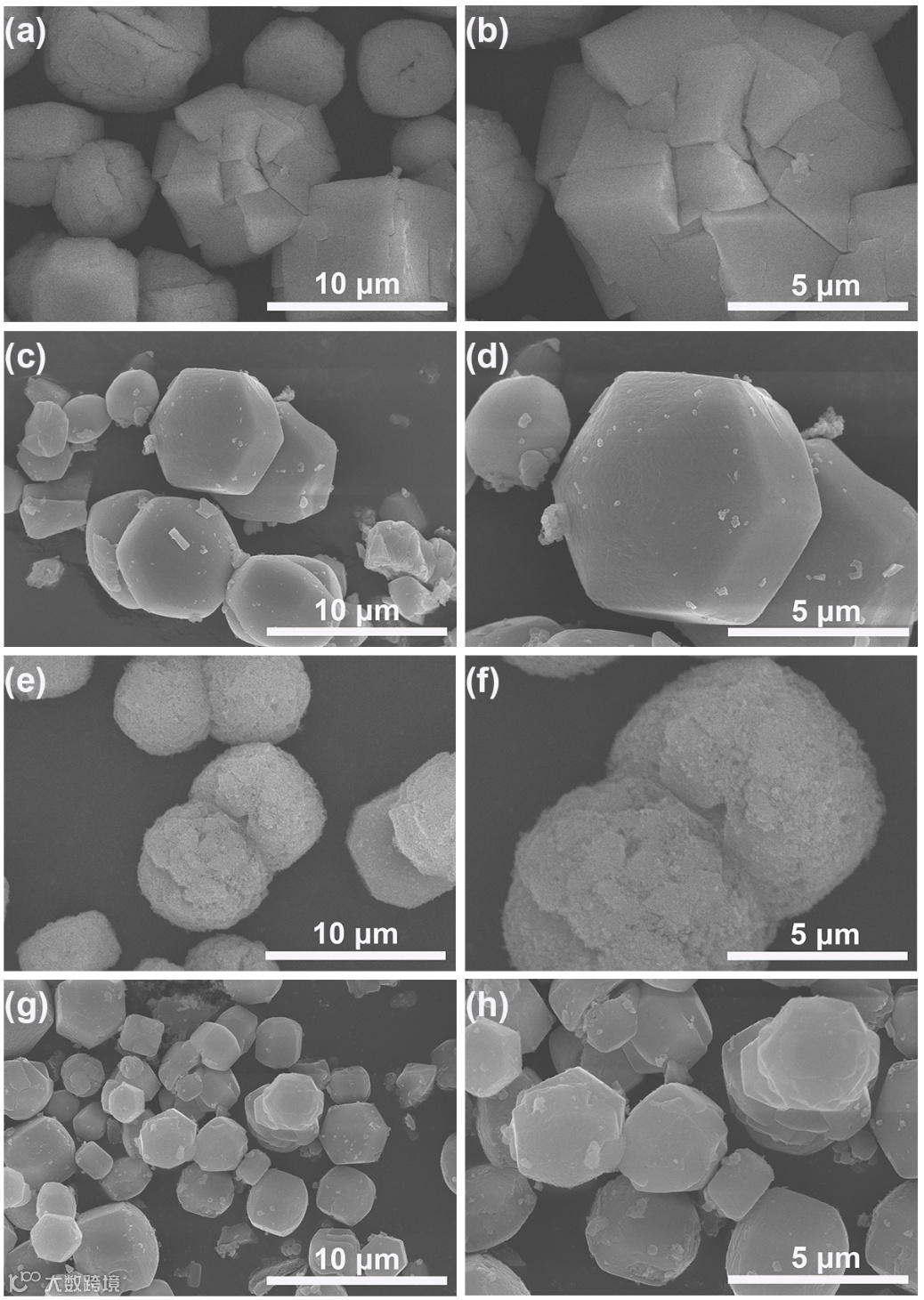 图 3 (a, b) FeF3-3H2O, (c, d) FeF3-0.33H2O, (e, f) FeF3-RT, (g, h) FeF3-HT的SEM图像