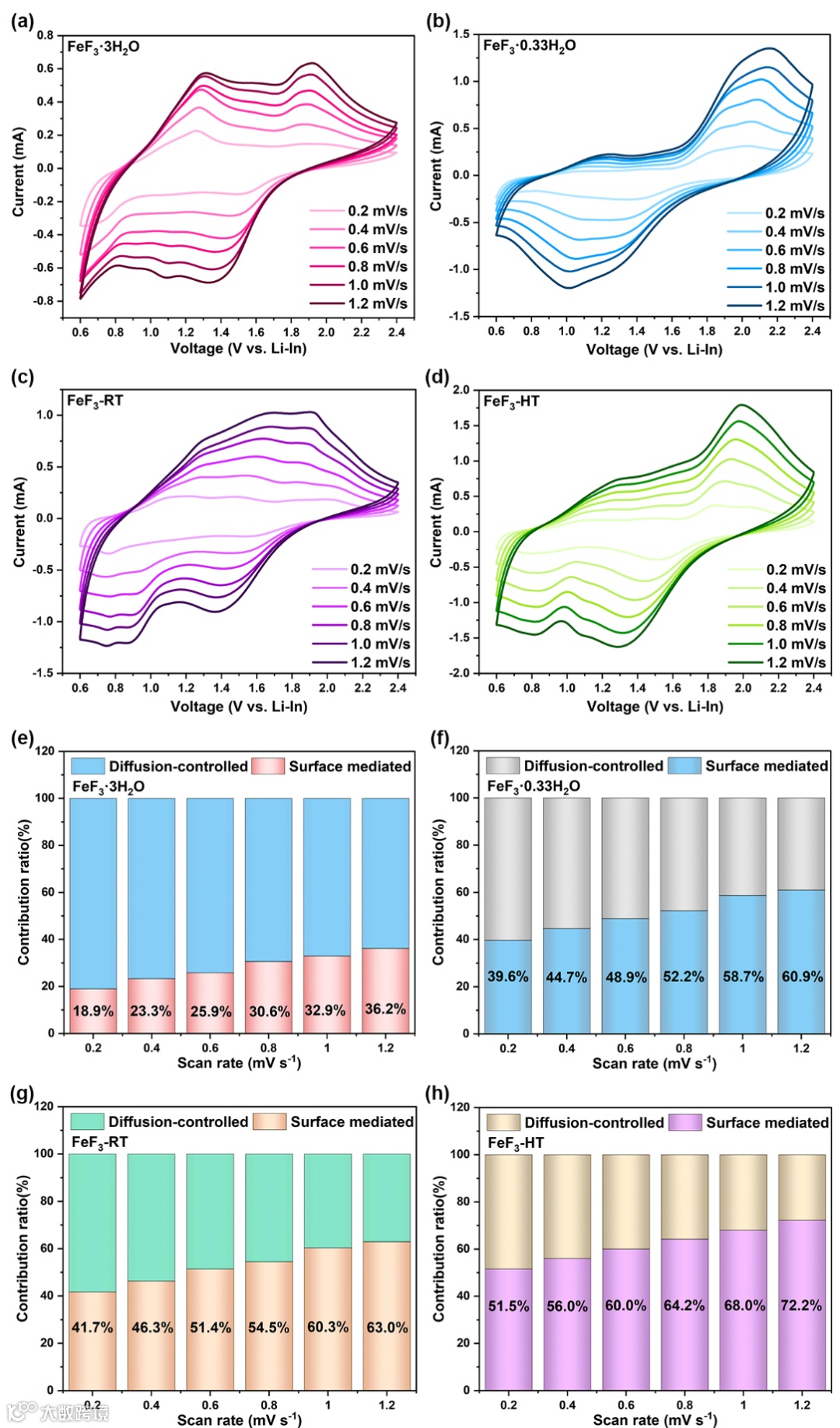 图9 (a) FeF3-3H2O, (b) FeF3-0.33H2O, (c) FeF3-RT, (d) FeF3-HT在不同扫描速率下的CV曲线。(e) FeF3-3H2O, (f) FeF3-0.33H2O, (g) FeF3-RT, (h) FeF3-HT阴极在不同扫描速率下的容量贡献。
