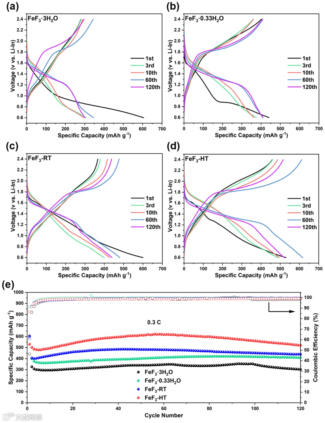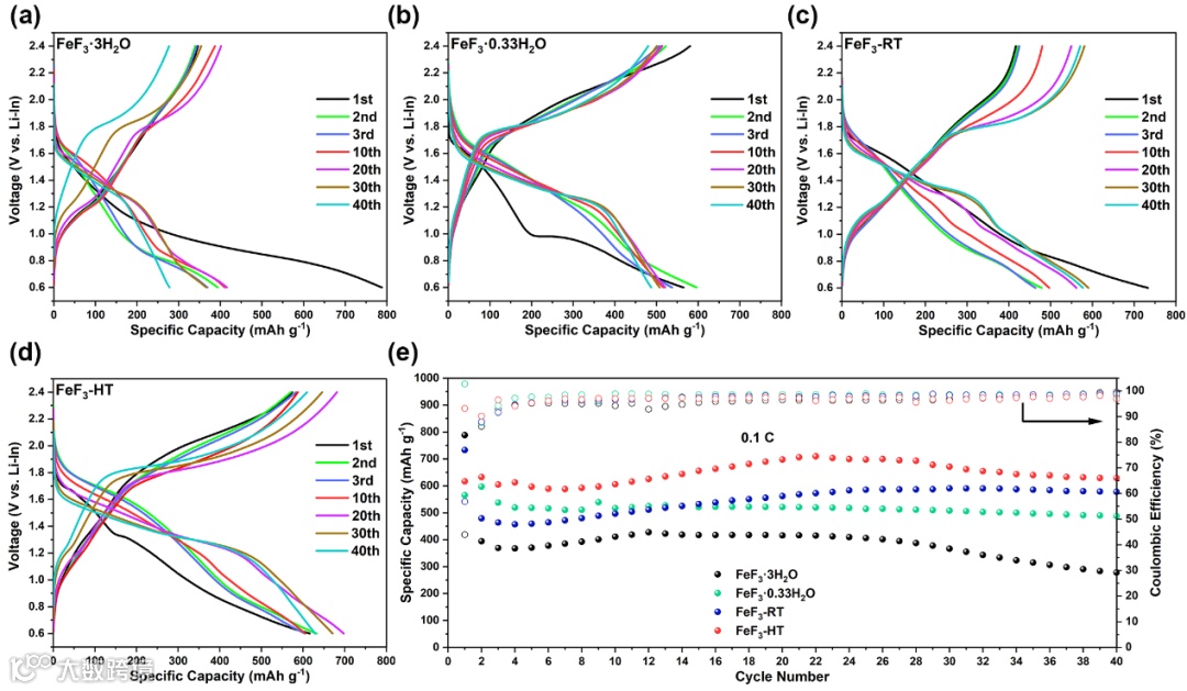 图5 (a) FeF3-3H2O (b) FeF3-0.33H2O (c) FeF3-RT (d) FeF3-HT在0.1 C(1 C=500 mA g-1)电流密度下的充放电曲线;(e) 四个正极在0.3 C的循环性能图。