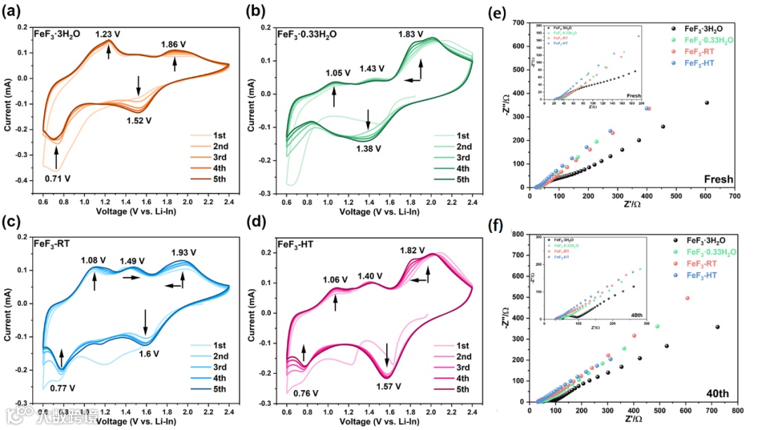 图8 (a) FeF3-3H2O, (b) FeF3-0.33H2O, (c) FeF3-RT, (d) FeF3-HT的CV曲线。FeF3-3H2O、FeF3-0.33H2O、FeF3-RT和FeF3-HT四种阴极的能奎斯特图(e)在第一个循环之前和(f)在40个循环之后。