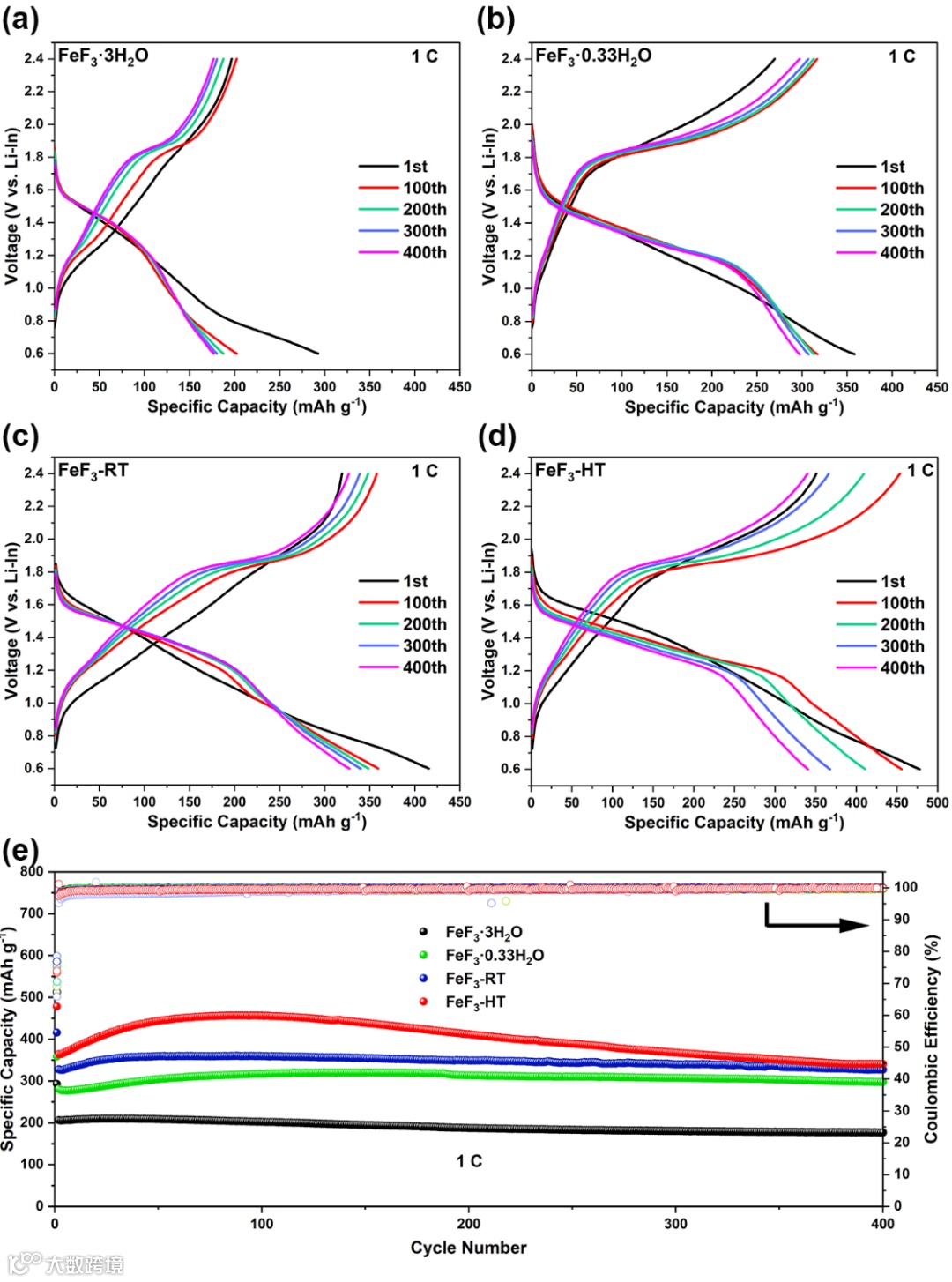 图7 (a) FeF3-3H2O (b) FeF3-0.33H2O (c) FeF3-RT (d) FeF3-HT在0.1 C(1 C = 500 mA g-1)电流密度下的充放电曲线;(e) 四个阴极在1 C的循环性能图。