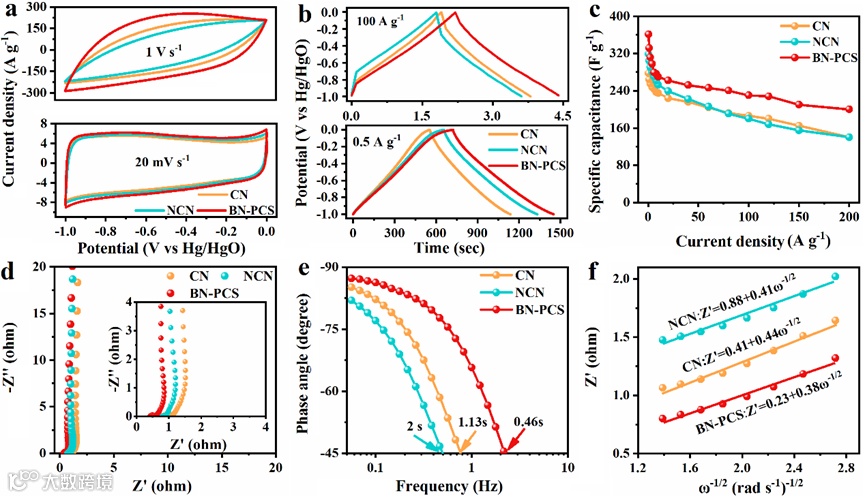 在6 mol L−1 KOH 电解液中,对CN、NCN以及BN-PCS的电化学性能进行评估。电化学测试结果表明,BN-PCS拥有优异的电容性能和出色的倍率性能。通过电化学阻抗谱分析了电极材料的动力学性能,BN-PCS具有最低的电荷转移电阻、最小的弛豫时间和最大的离子扩散系数,这得益于BN-PCS介孔为主的分级孔结构和硼氮共掺杂的效果。