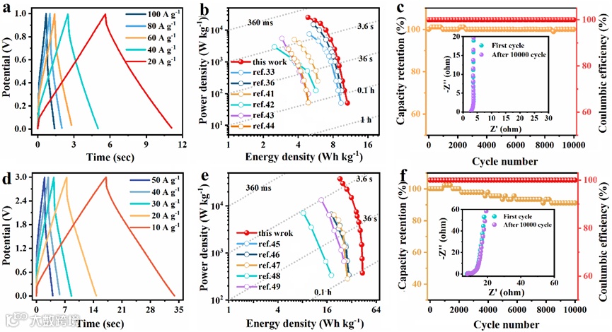 使用BN-PCS作为电极材料组装了对称超级电容器。在6 mol L−1 KOH 和1 mol L−1 TEABF4电解液中,BN-PCS电极材料均表现出优异的倍率性能和循环稳定性。在0.5 A g−1的电流密度下,器件可以获得43.5 Wh kg−1的高能量密度。经过10000次循环后,器件在氢氧化钾和有机电解液中的电容保留率分别为100%和91.1%,库伦效率均约为100%。