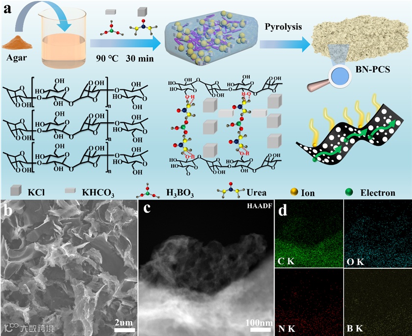 研究人员报道了一种简单的一锅熔盐法构建B, N共掺杂多孔碳片。以富含羟基的琼脂作为碳前驱体,其具有低成本和室温下凝胶化的独特能力,尿素作为氮源和结构引导剂,硼酸作为硼源和造孔剂。此外,以KCl/KHCO3二元共晶盐作为反应介质可以大大降低熔融温度(≈615°C),且熔融状态下的K2CO3可以增强与碳前体的相互作用,有助于形成高度多孔的碳结构。研究中通过改变硼酸、尿素和碳酸氢钾的加入量以及热解温度可以得到不同硼氮掺杂量的多孔碳片。