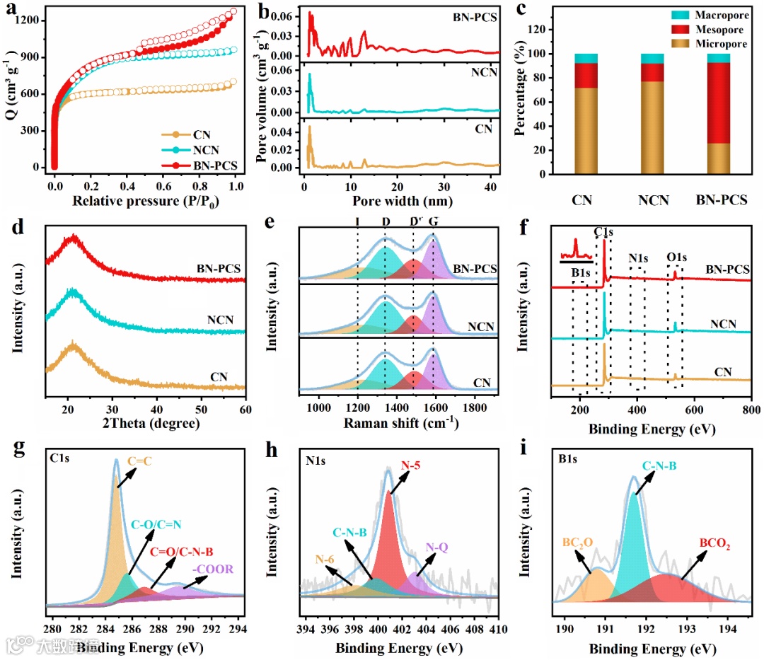 通过氮吸附脱附等温曲线、X射线衍射、拉曼光谱和X射线光电子能谱对材料的结构和化学性能进行分析。测试结果表明,硼酸的引入可以在碳材料中产生丰富的介孔和缺陷、大的比表面积以及杂原子掺杂,有助于提升电解质离子的储存和传输能力,从而实现优异的电化学性能。