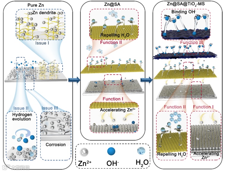 近日,安徽大学材料科学与工程学院吴明在教授团队在国际知名期刊Adv Funct Mater上发表题为“Shooting Three Birds with One Stone: the Regulation of Zn2+, H2O and OH- Kinetics for Stable Zn-Metal Anodes with a Multifunctional Sieve”的文章。该文章分析了锌金属负极产生枝晶生长和界面副反应的机制,提出在锌片表面制备一种由TiO2无机纳米层和硬脂酸(SA)有机分子层共同组成的多功能筛(Zn@SA@TiO2-MS)以调控Zn2+、H2O和OH-动力学特性获得稳定的锌负极。