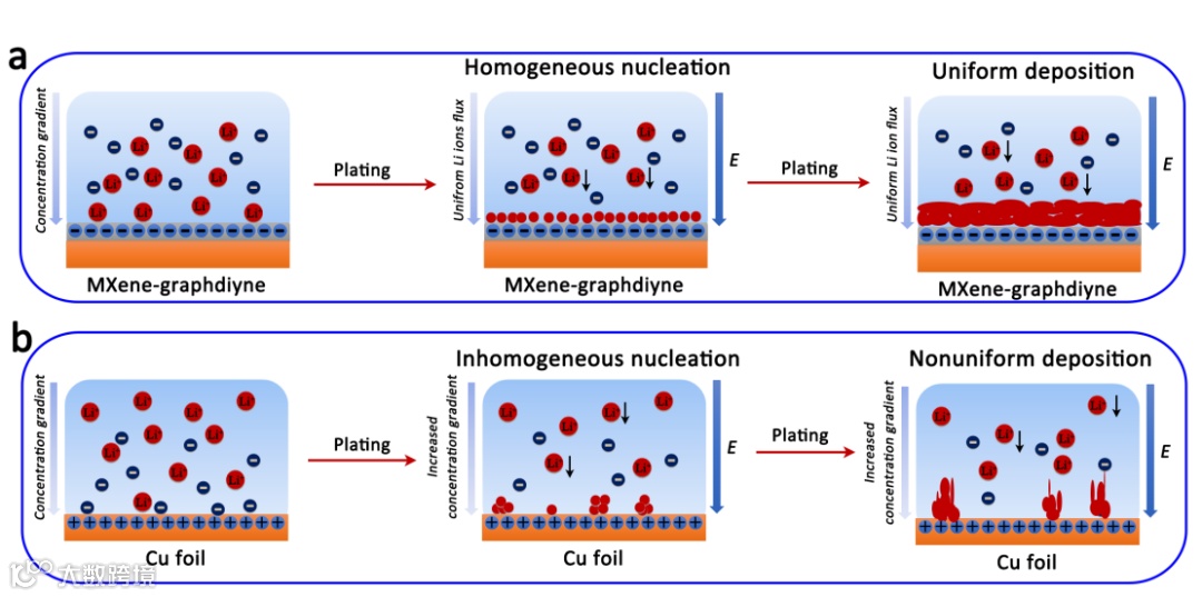 图1. 金属锂分别在(a)高Zeta电位MXene-graphdiyne电极和(b)金属Cu基底沉积过程示意图。