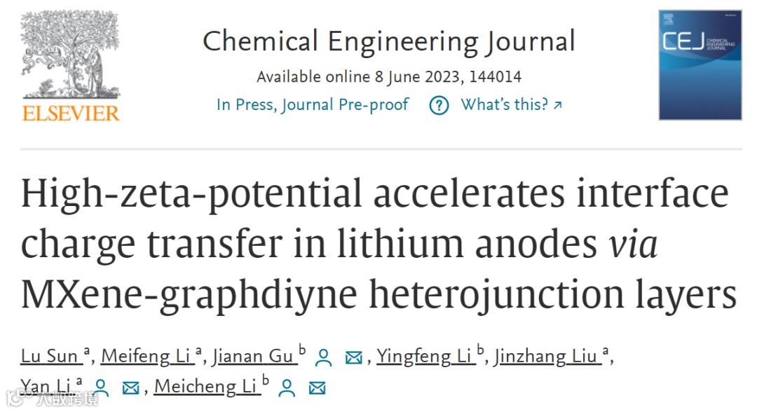 近日,北京航空航天大学李岩教授团队联合华北电力大学李美成教授、顾佳男副教授团队,在国际知名期刊Chemical Engineering Journal上发表题为“High-Zeta-Potential Accelerates Interface Charge Transfer in Lithium Anodes via MXene-Graphdiyne Heterojunction Layers”的观点文章。该观点文章提出采用静电自组装方法制备高Zeta电位的Ti3C2Tx-graphdiyne异质结(MXene-graphdiyne)材料,以加速锂沉积过程中的界面电荷转移。