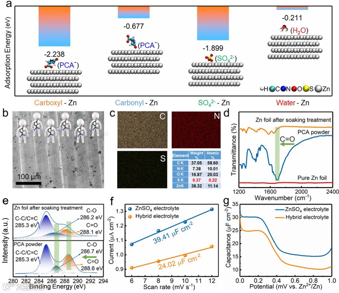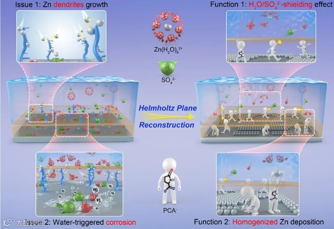 针对上述问题,安徽大学胡海波教授与香港理工大学姚海民教授合作提出了锌阳极表面的亥姆霍兹平面重构策略,以抑制长期循环中的枝晶及腐蚀行为。该文通过吡咯烷酮羧酸锌 (PCA-Zn) 添加剂所活化的ZnSO4电解质,成功实现了在ZMAs界面处亥姆霍兹平面 (HP) 的重构。系统实验和计算模拟表明,具有双亲锌末端的解离化PCA−阴离子优先附着在ZMAs表面,羧基作为锚点取代H2O和SO42−,形成排斥H2O和SO42−的HP以抑制水触发的副反应。同时,PCA−阴离子的其他游离亲锌羰基末端使MZAs表面重组后的HP对Zn2+具有强烈的空间约束作用,有效抑制了Zn沉积过程中无序的平面内扩散,同时起到了均匀化Zn离子通量的作用。此外,在循环过程中,HP的存在对电极表面的意外损伤表现出优异的自我修复能力。这项工作不仅揭示了HP调节和界面Zn电镀/剥离化学稳定之间的相关性,而且对如何选择有效的添加剂来优化稀释盐电解质以在ZMA上进行无枝晶沉积以提高全AZMBs的充电能力提供了指导。