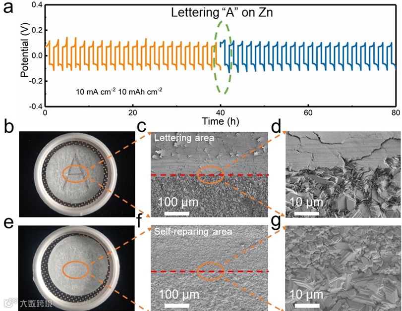 消费电子产品在长期的日常使用过程中,不可避免地会遇到意外跌落、碰撞、撞击等引起的机械损伤。为了保证整个系统的不间断运行,要求集成电源不仅具有较高的能源效率,而且具有良好的机械损伤容忍度。考虑到混合电解质中剩余的游离PCA− 阴离子以及其在动态平衡中构成的HP层,因此,当HP层突然遭受严重破坏时,会发生快速的自我修复过程,这进一步使ZMAs对由于不均匀应变分布和循环时外部机械冲击造成的意外表面损伤具有特殊的耐受力。