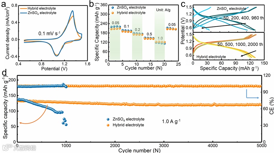 ZMAs表面重构的HP可以通过调节Zn均匀沉积和抑制界面腐蚀来增强ZMAs的稳定性并提高其利用率,在carbon-cloth@polyaniline||Zn全AZMBs中,纯硫酸锌电解质仅960次循环后便出现故障,而包含PCA-Zn添加剂的电解质其可充电性能显著提高 (5000次循环后容量保留率为89.7%),证明了该策略在实际应用和广泛推广中的可行性。