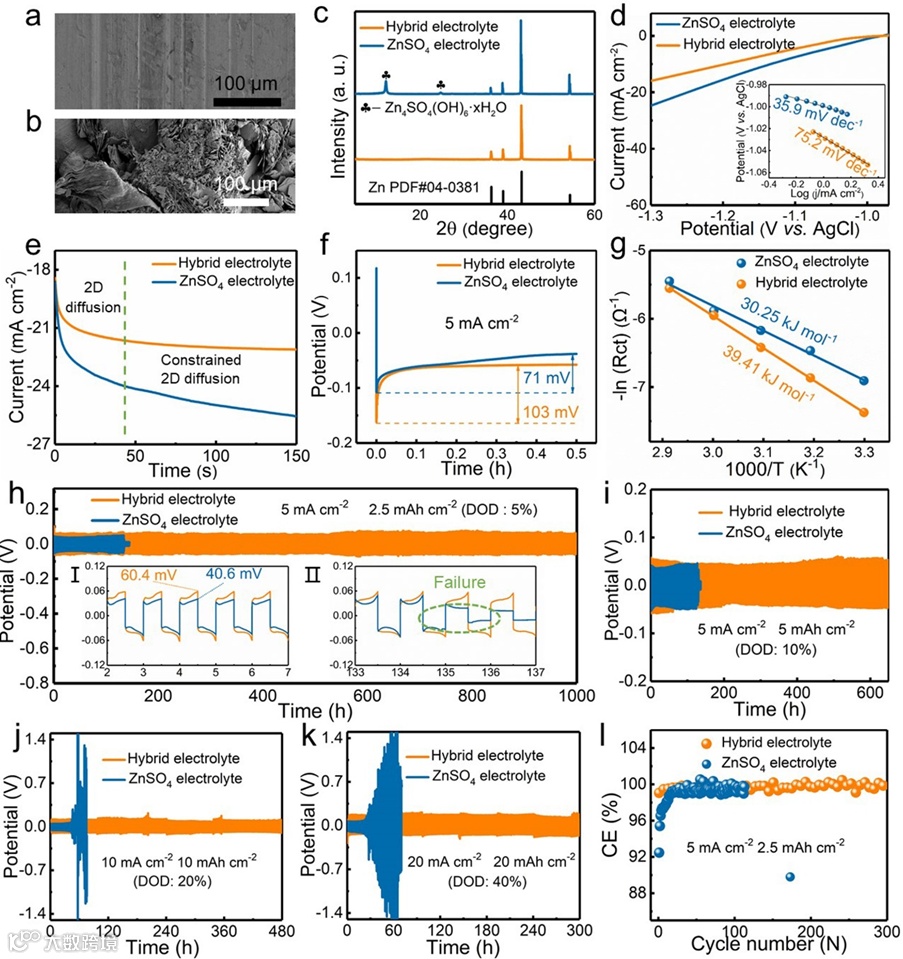 吸附在锌板表面的PCA− 阴离子将进一步在AEI中进行重构,形成新的排斥H2O和SO42−的HP层,从而使锌箔具有良好的耐腐蚀性。除此之外,由于富含强锌亲和力的自由羰基供体基团的PCA− 阴离子与Zn2+ 之间具有强烈的相互作用,由大量PCA−阴离子组成的HP将会对Zn2+ 产生空间限域效应。因此,如图3h-k所示,得益于PCA-Zn/ZnSO4混合电解质中重构HP对水诱发的副反应的抑制和Zn金属表面离子通量的均匀化,从而可以有效的地延长Zn阳极的电镀/剥离寿命。