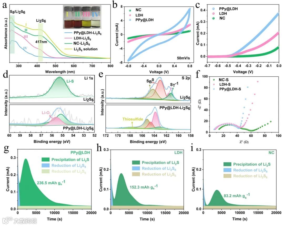 图3. a) Li2S6溶液被PPy@LDH、NC和NiCo-LDH宿主材料吸附的UV-vis光谱和光学图像(插图)。b)基于不同电极的对称电池的CV曲线。c) Li2S氧化测试。d) PPy@LDH对Li2S6吸附前后的Li 1s和e) S 2p的变化。f)不同电极的EIS光谱。g-i) Li2S沉积测试。