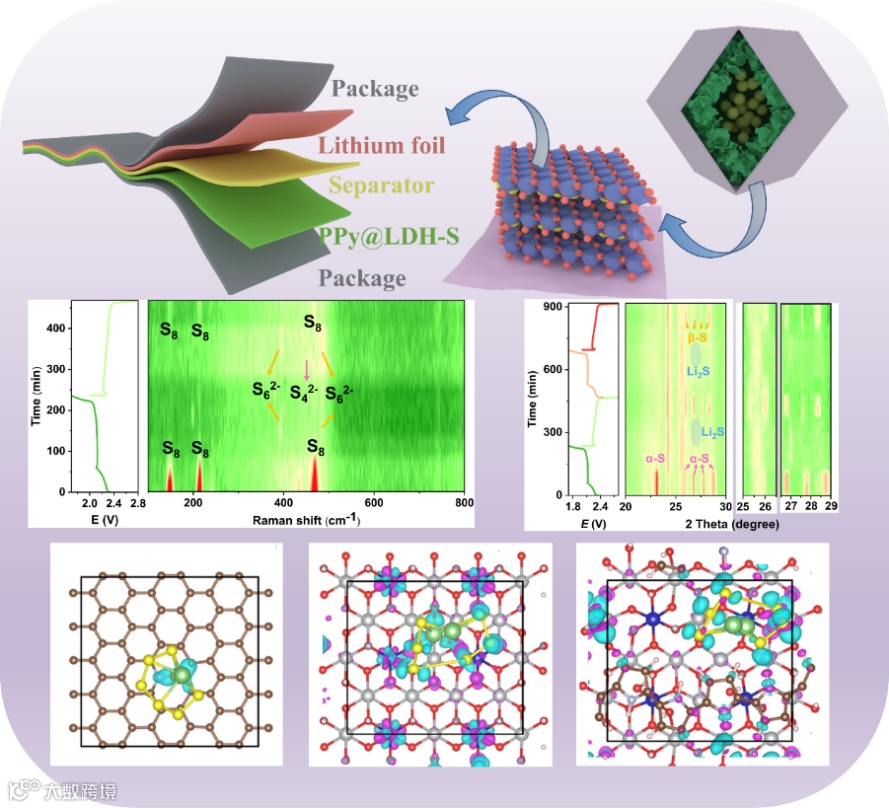 原位XRD和Raman等表征技术揭示了材料在充放电过程中多硫化物相演化。PPy@LDH宿主材料在锂硫电池中作为硫正极宿主时加速了多硫化物的氧化还原反应并且表现出良好的可逆循环性,反应过程经历了α-S8 → LiPSs → Li2S → LiPSs → β-S8的转变,并且在拉曼测试中发现了Li2S6、Li2S4、Li2S的生成和消失,还原了整个锂硫电池反应过程中相的变化。
