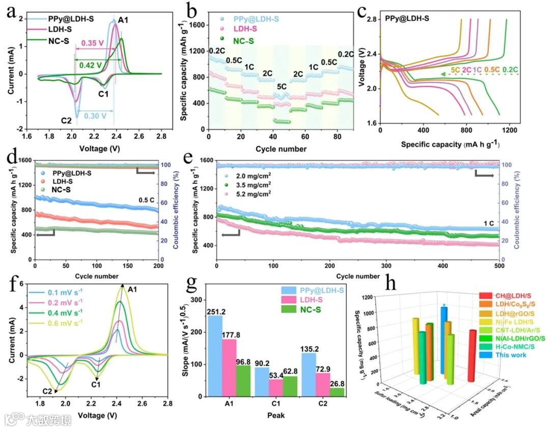 图5. a) CV曲线,b)不同电极倍率性能。c) PPy@LDH-S电极在不同电流密度下的电压分布。d)不同电极在0.5C下的可循环性分析。e)不同含硫量的PPy@LDH-S电极的长循环性能。f) 0.1 ~ 0.6 mV s-1扫描速率下PPy@LDH-S电极的CV曲线。g)图3f中A1、C2、C1峰的Ip/V0.5值。h) 与以前文章比较。