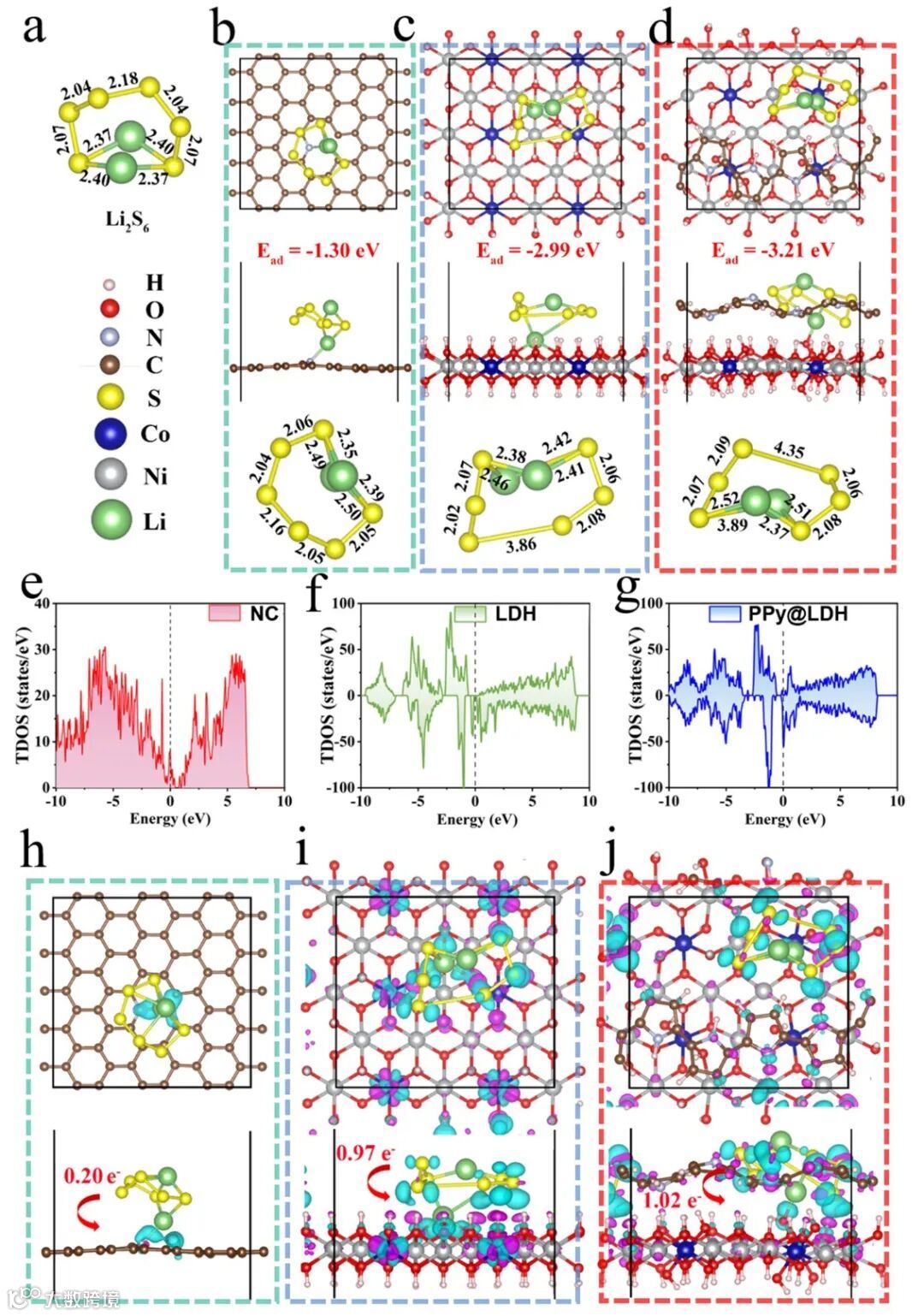 图2. a)锚定前Li2S6的原子结构。b) NC, c) NiCo-LDH和d) PPy@LDH锚定的Li2S6稳定吸附构型的顶视图(上)和侧视图(中),以及对应的Li-S和S-S对应的键长 (下)。总态密度e) NC, f) NiCo-LDH和g) PPy@LDH。h) NC, i) NiCo-LDH和j) PPy@LDH锚定的Li2S6电荷密度的俯视图和侧视图。
