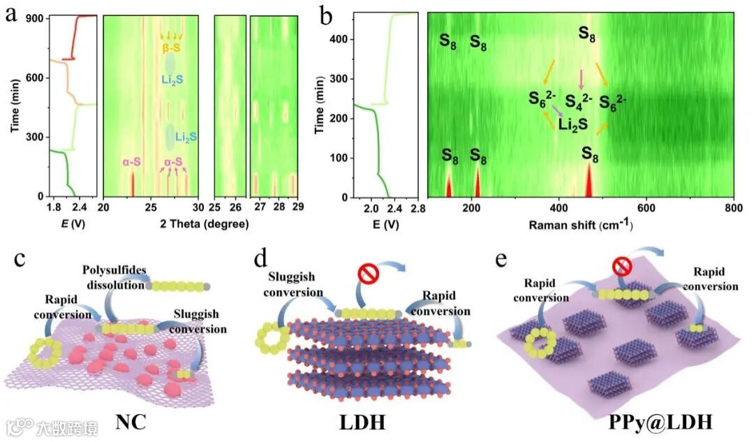 图4. a) PPy@LDH-S电极的原位XRD测试。b) PPy@LDH-S电极的原位拉曼测试。c-e) NC、LDH和PPy@LDH对多硫化物的吸附和催化示意图。