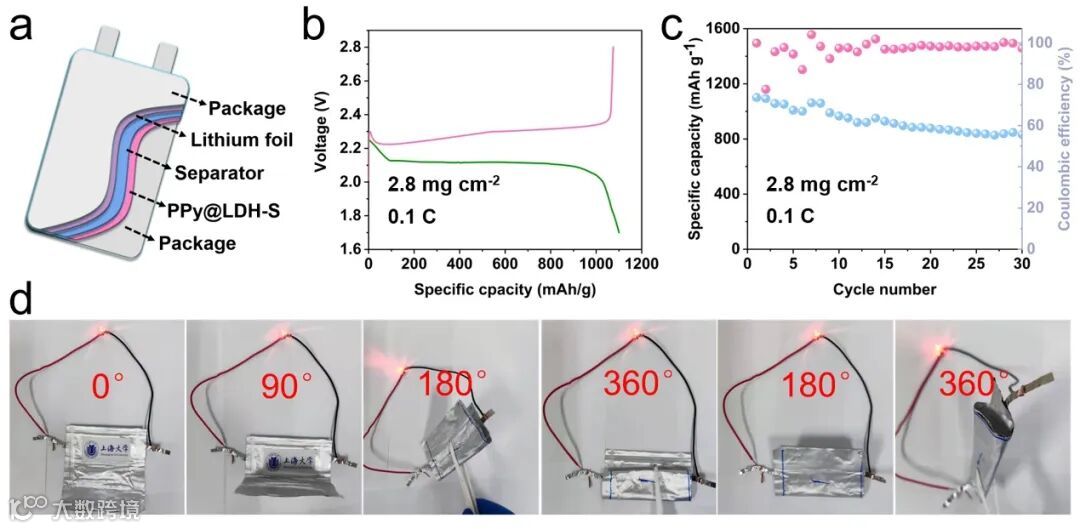 图6. a)软包电池示意图。b)在0.1 c时高硫负荷2.8 mg cm-2的软包电池电压分布。c)软包的循环性能。d)展示了不同角度下软包电池的折叠过程。