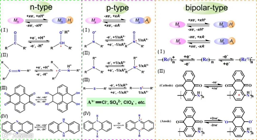 图2. n型、p型和双极性型有机电极材料的质子存储机制。