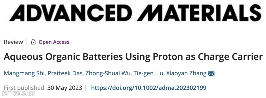 Aqueous organic batteries using proton as charge carrier, Mangmang Shi, Pratteek Das, Zhong-Shuai Wu, Tie-gen Liu and Xiaoyan Zhang*, Adv. Mater. 2023,doi.org/10.1002/adma.202302199
