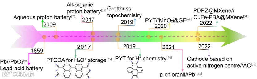 图1. 有机电极材料用于水系质子电池的发展时间线图。