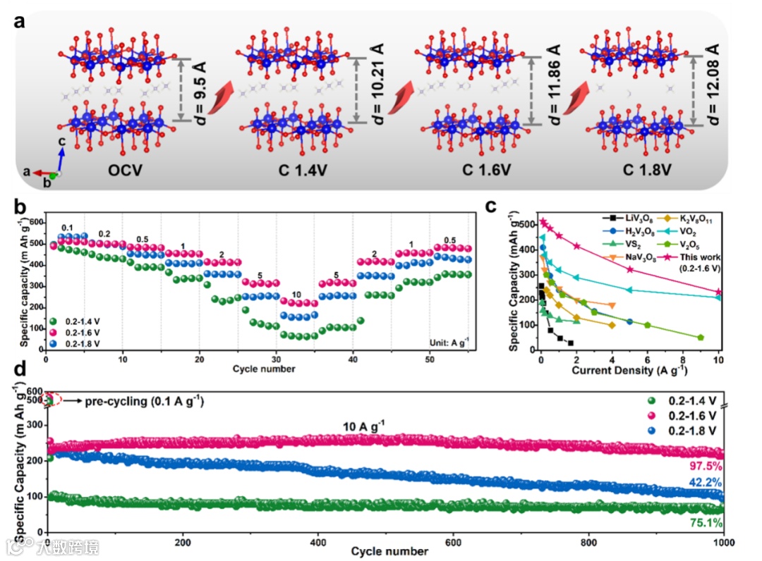 图1. 通过调控充电过程中的上限截止电压,实现钒酸铵的层间距定量可控调节,助力其在水系锌离子电池中倍率和长循环性能的提升