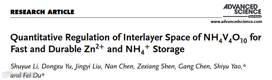 基于此,吉林大学杜菲教授团队在国际知名期刊Advanced Science上发表题为“Quantitative Regulation of Interlayer Space of NH4V4O10 for Fast and Durable Zn2+ and NH4+ Storage”的文章。