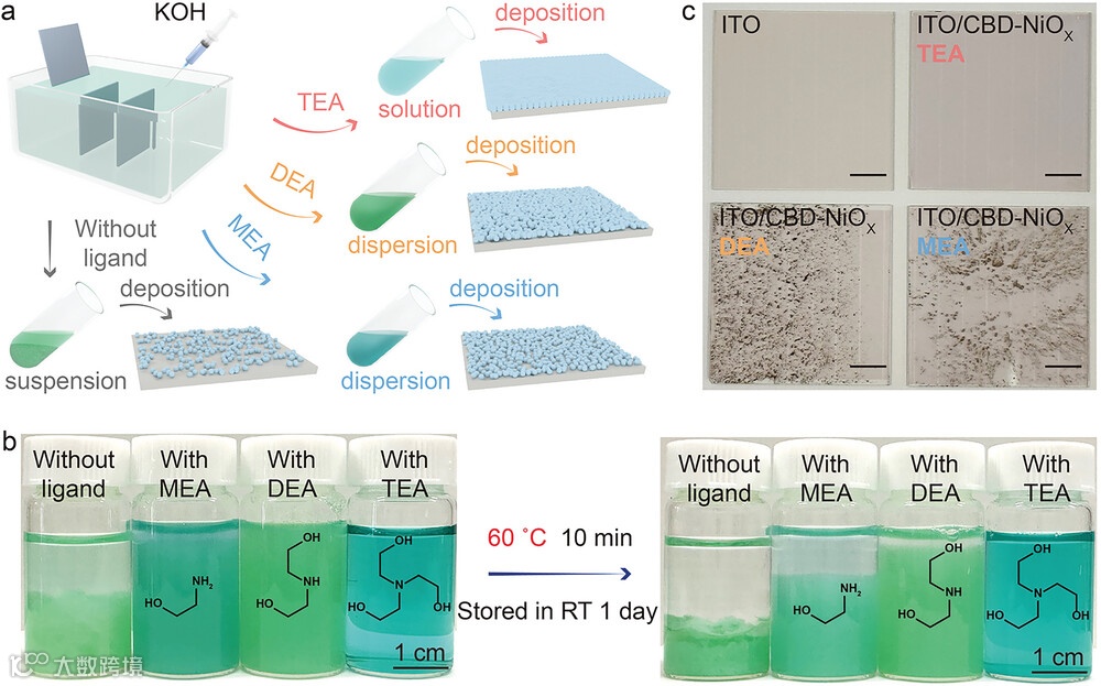 图1. 化学浴沉积的氧化镍薄膜在不同配体下的沉降模型,以及薄膜不均匀沉积的解决方案。