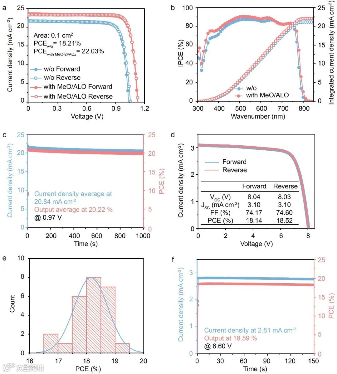 如图2所示,该策略在钙钛矿光伏组件的应用中得到进一步证明,通过控制Ni2+释放速率得到了可规模化、均匀且致密的CBD-NiOx空穴传输层基底,再经过MeO-2PACz/Al2O3的修饰后,其最高组件效率可达19.03% (活性面积18.1 cm2),并且在大气氛围中未封装的情况下其稳定功率输出无明显变化。