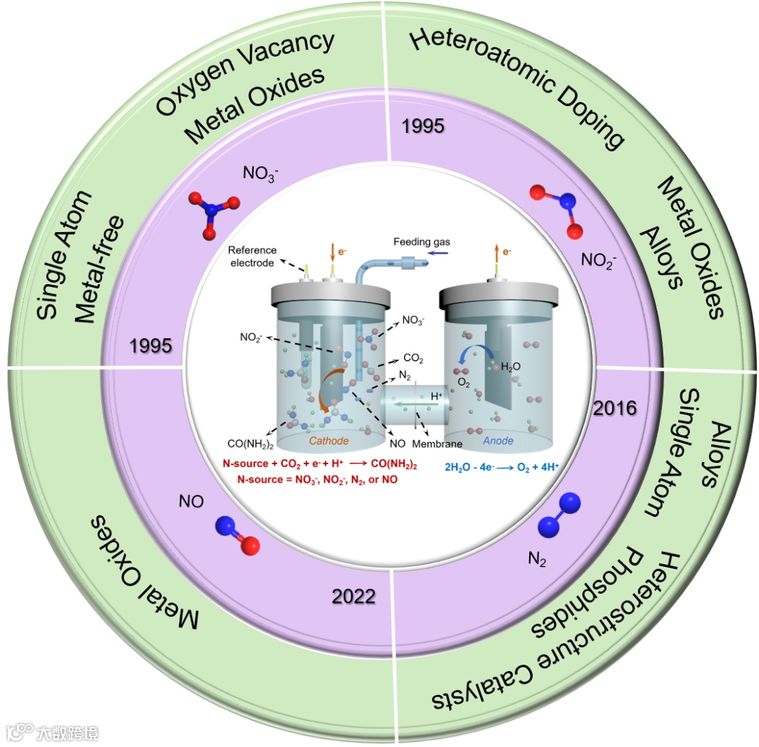 通过电化学路径将环境中的温室气体CO2和含氮物质共还原为具有更高附加值的尿素,对实现碳中和、碳/氮循环利用、间歇式能源有效存储以及缓解环境污染等问题具有重要意义。尽管越来越多的研究在电化学尿素合成方面取得了一些突破,但其尿素产率低、法拉第效率不理想、C-N耦合反应机理不明析等问题仍然是其大规模实际应用的主要障碍。