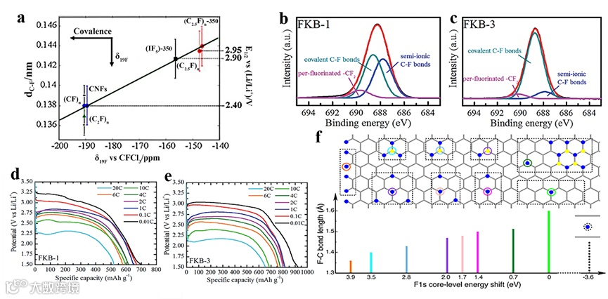 2. 电池放电电压,与C-F键强度和材料导电性有关,从热力学定性推导可知C-F键强越大放电电位越低,而且共价型C-F键的形成导致其相应的碳骨架从sp2杂化转变为sp3杂化,导电性下降导致较大的极化,从而降低放电电压;