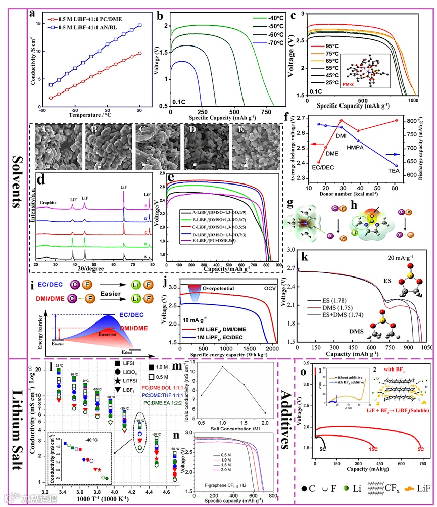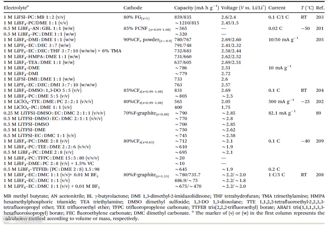 尽管LiF是SEI膜中有益的成分,作为放电产物,氟化碳电池中LiF的量远远超过了SEI形成需要的量,因此氟化碳电池中的LiF是弊大于利的。然而,目前通过氟化碳材料的设计和处理无法解决这个问题,因此很多电解质的研究围绕着溶解LiF或者影响LiF的形成和形貌进行。除此之外,部分电解质能够通过影响C-F键提高电池动力学,如有的溶剂能够削弱C-F键从而提高电池放电电压。还有的电解质能够自己参与放电反应,进一步提高电池容量,具有两种以上功能的电解液称为多功能电解液,是未来氟化碳电池电解质开发的重要方向之一。