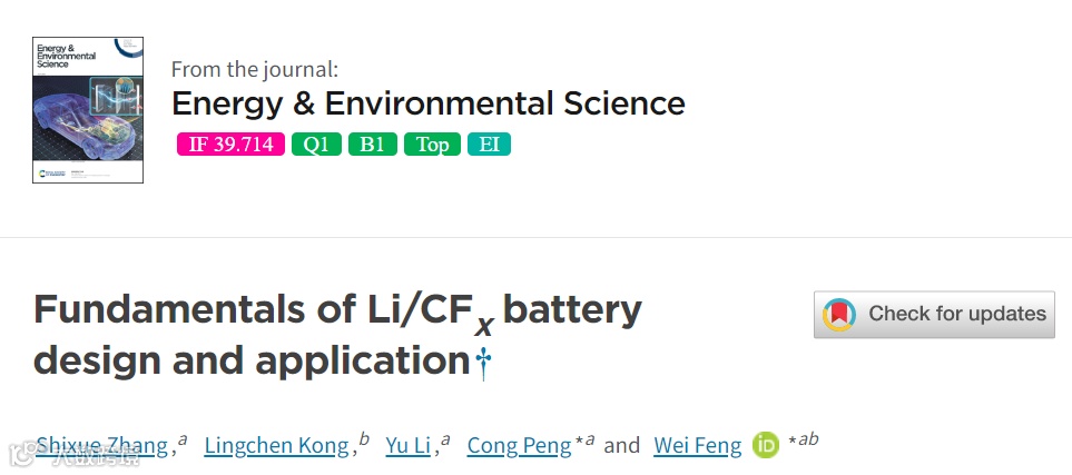 近日,封伟教授团队在国际知名期刊Energy & Environmental Science上发表题为“Fundamentals of Li/CFx battery design and application”的综述文章。该综述从Li/CFx电池的工作机理出发,详细的论述了CFx材料和电池之间的构效关系,并提出了能量导向的材料合成策略来帮助读者理解碳源结构,氟化条件和最终CFx结构的关系。