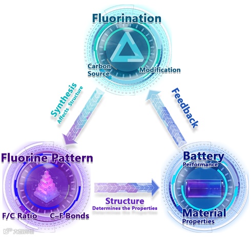 CFx是一种由多个氟化纳米畴组成的没有最小重复单元的碳衍生物,其结构主要受到碳材料的结构和氟化工艺的影响。碳材料不仅影响CFx的骨架结构,还会影响氟化过程的难易,因此碳材料,氟化工艺和最终CFx的结构之间有复杂的关系。本文提出能量引导的