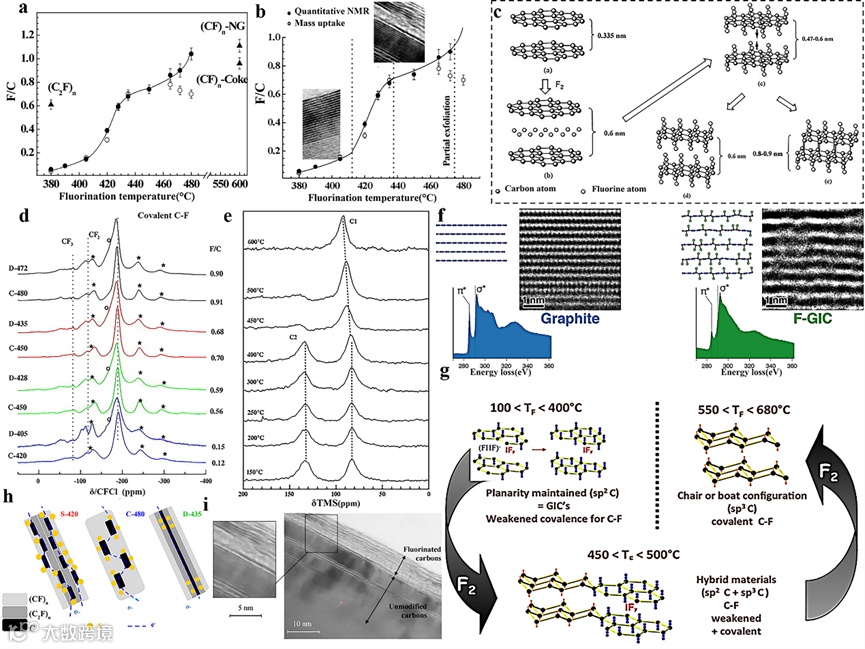 合成策略,从能量的角度对这三者之间的关系进行简化。简单来说,不同结构的碳材料能量不同,比如曲率大或缺陷多的碳在氟化时反应活性高,因此与完美的石墨相比,这些富缺陷的碳在较低的氟化温度下就可以形成较多的C-F键,既得到较高的F/C比。另外,氟化剂的扩散和C-F键的形成都是耗能过程,因此除了F/C比之外,C-F键的强度也与碳的结构和温度有关,形成高强度的共价C-F键需要碳材料由原本sp2杂化的平面结构转变成褶皱的sp3杂化,因此高温条件下合成的氟化碳导电性较差。