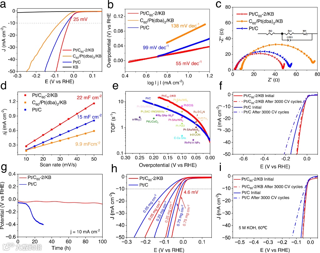 图2. Pt/C60-2和商业Pt/C的HER性能:(a)Pt/C60-2/KB、C60/Pt(dba)2/KB、Pt/C与KB在1 M KOH中的LSV曲线;(b)Tafel斜率图;(c)Pt/C60-2/KB、C60/Pt(dba)2/Kb与Pt/C在过电位为150 mV(vs RHE)时的Nyquist图;(d)双电层电容图;(e)Pt/C60-2/KB、Pt/C与其他报道的催化剂在不同过电位下的TOF值;(f)Pt/C60-2/KB与Pt/C在3000圈CV循环前后的LSV曲线;(g)在10 mA cm-2电流密度下的长时间稳定性测试图;(h)Pt/C60-2/KB与Pt/C在不同负载量下的HER极化曲线;(i)Pt/C60-2/KB与Pt/C在5 M KOH,60℃下进行3000圈CV循环前后的LSV曲线。