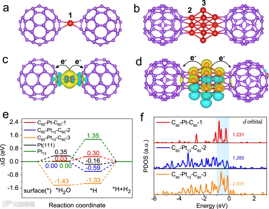 图3. 理论分析不同Pt位点的电子结构和能量图:(a)Pt单原子和(b)Pt团簇优化模型图;(c)C60-Pt-C60和(d)C60-Pt13-C60的电荷差分密度图,蓝色和黄色分别代表电子密度的降低和增加;(e)H2O和H在C60-Pt-C60-1、C60-Pt13-C60-2、C60-Pt13-C60-3、Pt (111)和 Pt13 团簇表面的吸附能;(f)C60-Pt-C60-1、C60-Pt13-C60-2 与C60-Pt13-C60-3中Pt原子的PDOS图。