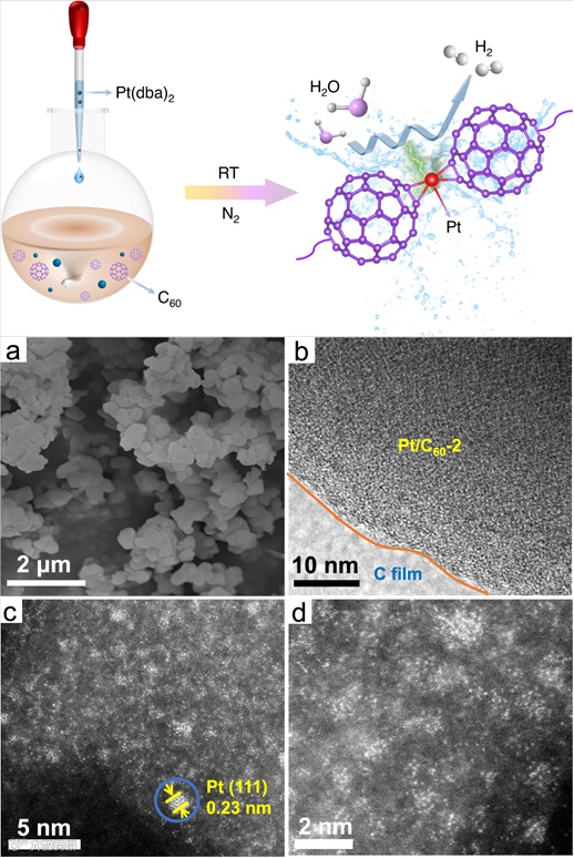 富勒烯是具有明确分子结构的零维纳米碳,可在室温下通过化学反应对其表面进行功能化。具有二十面体(Ih)对称性的富勒烯C60不仅具有曲面结构,而且具有独特的吸电子特性,可接受1-6个电子。此外,C60的近sp2杂化碳表面存在缺电子烯族的C=C键,可以以η2-C60 π型键合模式锚定金属原子。基于此,作者使用C60作为载体锚定Pt单原子,通过湿化学法在室温下合成了系列Pt/C60催化剂,负载量高达ca. 21 wt%,其内部结构为Pt-C60聚合结构,其中主要的Pt单原子连接两个相邻的C60分子。