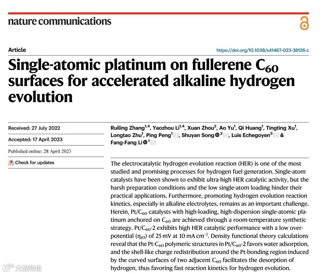 论文原文:Ruiling Zhang,1 Yaozhou Li,1 Xuan Zhou,2 Ao Yu,1 Qi Huang,1 Tingting Xu,1 Longtao Zhu,1 Ping Peng,1* Shuyan Song,2* Luis Echegoyen,3* Fang-Fang Li1*, Single-atomic platinum on fullerene C60 surfaces for accelerated alkaline hydrogen evolution, Nature Communications, (2023) 14:2460.