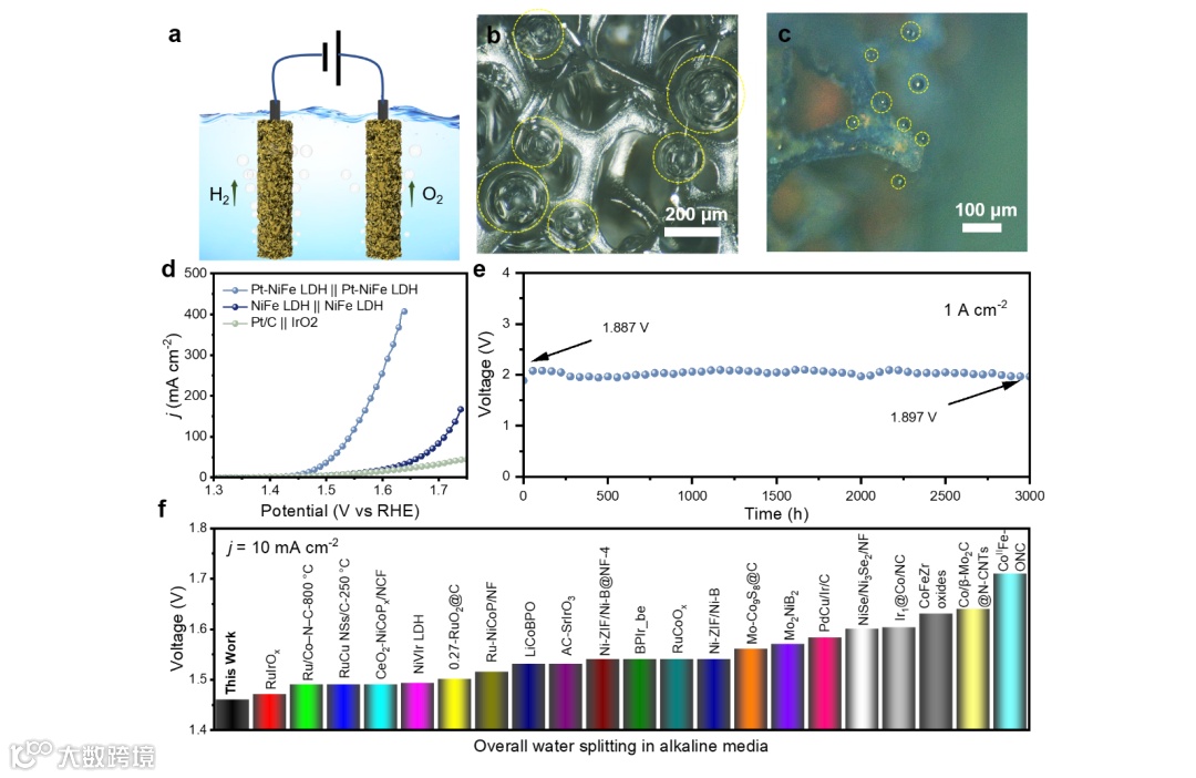 图二:原位光学显微镜观察气泡溢出情况及其两电极水分解性能