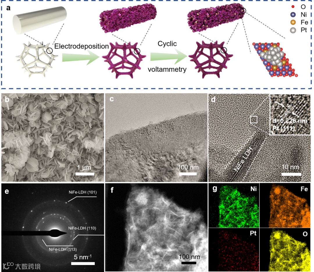 1、电化学合成铂负载的NiFe层状双氢氧化物(Pt-NiFe LDH)。采用两步法,先在泡沫镍上沉积NiFe LDH后,通过循环伏安扫描得到了Pt-NiFe LDH。