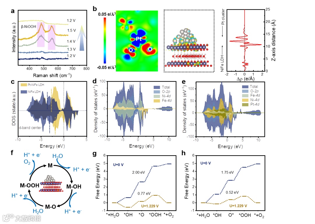 3、原位Raman表明当电位高于1.4 V,Ni转换为NiOOH,进一步基于DFT的理论计算表明在NiFe LDH上引入Pt团簇改变了NiFe LDH和Pt周围的电子结构从而进一步降低了OER的能量壁垒。