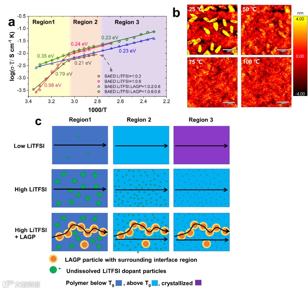 锂离子在复合固态电解质内部的传输路径依然相对未知。本研究通过控制聚合物,锂盐,陶瓷电解质颗粒的质量比,从而制备出不同成分的固态电解质。通过测试各种成分固态电解质在不同温度下的离子电导率,进而获得不同成分如锂盐、陶瓷电解质对于离子传输路径的影响。实验结合核磁共振,电子显微镜,原子力显微镜等技术手段表明:玻璃化转变温度之下(55°C)陶瓷/聚合物界面是离子传输的主要通道,随着温度的升高,聚合物基体中锂离子浓度增加(锂盐融化)会显著提高聚合物离子传导率,甚至取代陶瓷/聚合物界面,成为复合固态电解质主要的离子传输路径。