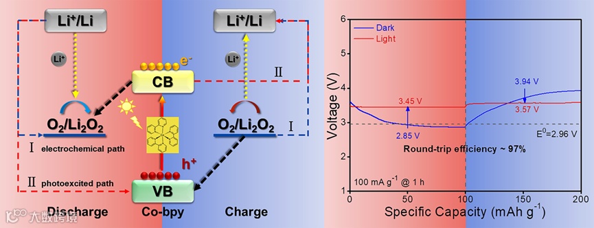 图1. Co-bpy作为电子介体在光辅助锂氧电池中的双电路能量图,以及在LOB中实现97%的高往返效率。