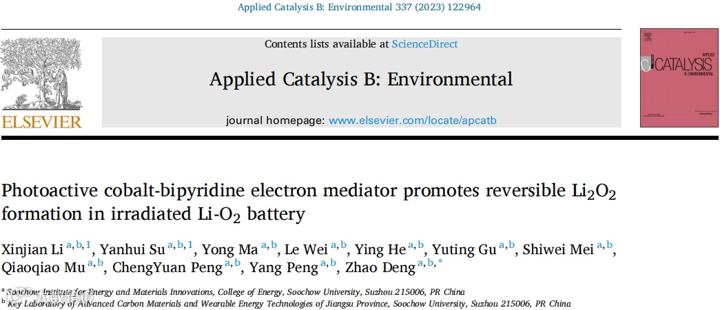 近日,来自苏州大学的邓昭教授,在国际知名期刊Applied Catalysis B: Environmental上发表题为“Photoactive cobalt-bipyridine electron mediator promotes reversible Li2O2 formation in irradiated Li-O2 battery”的研究文章。该文章分析了现在常用的太阳能辅助的光催化剂,并总结了现有多数光活性材料存在复杂的合成过程并且耗能严重,提出了一种合成方法简单、可大量制备和光电催化活性优异的金属有机络合物钴吡啶催化剂,这项工作不仅将光电阴极催化剂家族扩展到小分子络合物,而且为LOBs中的光能存储机制提供了新的见解。