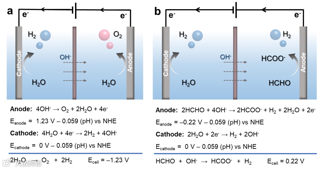 Fig. 1 Schematic illustration of water electrolysis and HCHO electrooxidation. a Conventional electrocatalytic water splitting under alkaline conditions. b Electrocatalytic water reduction coupled with HCHO oxidation under alkaline conditions.