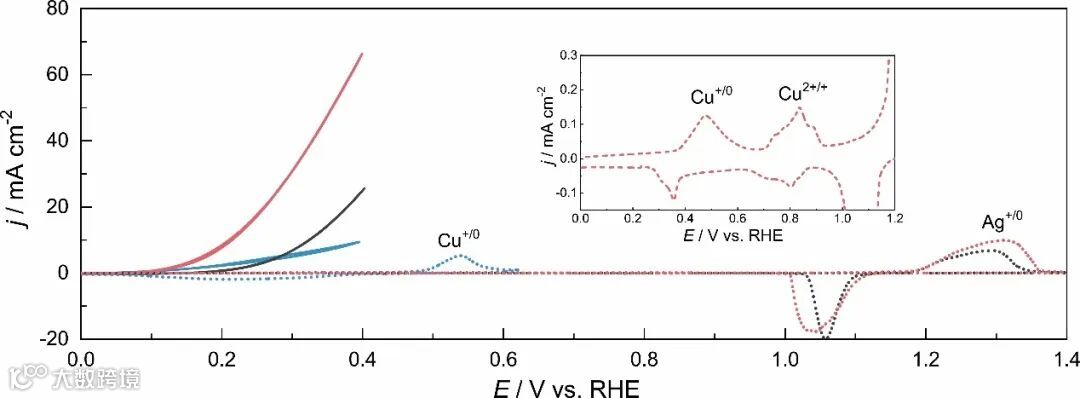 (1)筛选用于甲醛氧化的催化剂:基于甲醛电氧化之前的报道,我们利用Cu和Ag的硝酸盐作为原料,通过简易的电沉积在旋转圆盘电极上制备相应的金属电催化剂。如图2所示,在没有HCHO的情况下,Cu/RDE在0.5 V vs RHE出现氧化峰(Cu+/0),Ag/RDE的氧化峰在~1.2 V vs RHE。当加入0.6 M HCHO时,Cu/RDE在0.05 V vs RHE处有明显的阳极电流上升,在0.4 V vs RHE达到10 mA/cm2,表明在Cu/RDE上发生HCHO电化学氧化。